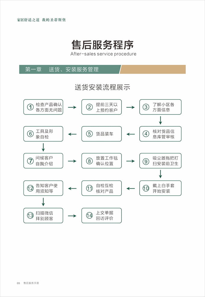 產(chǎn)品處理完畢后必須一站式通檢,指導客戶(hù)使用,并將服務(wù)過(guò)程中產(chǎn)生的垃圾隨手帶走,家具維修完畢后,應用毛巾將家具擦拭一遍,確保產(chǎn)品清潔。