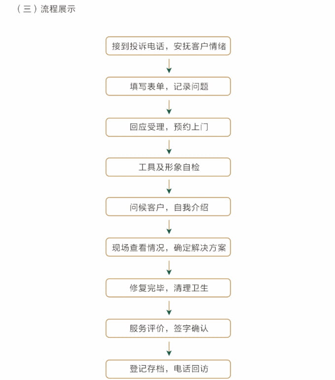 必須按照客戶(hù)約定,至少提前5分鐘上門(mén),見(jiàn)到客戶(hù)時(shí)需自我介紹,并出示上崗證和名片,在進(jìn)入顧客家前應穿上自備的鞋套。征得客戶(hù)同意后開(kāi)始維修,嚴禁亂收費。